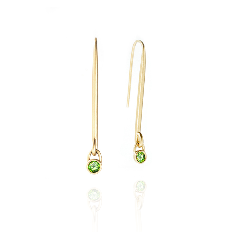 The Demantoid Drop Earrings are a masterclass in restraint. A sleek, elongated 18K yellow gold wire drops cleanly from the ear, its single bezel set demantoid garnet swinging freely at the tip — a tiny flash of vivid electric green that catches the eye precisely because everything around it is so perfectly quiet.